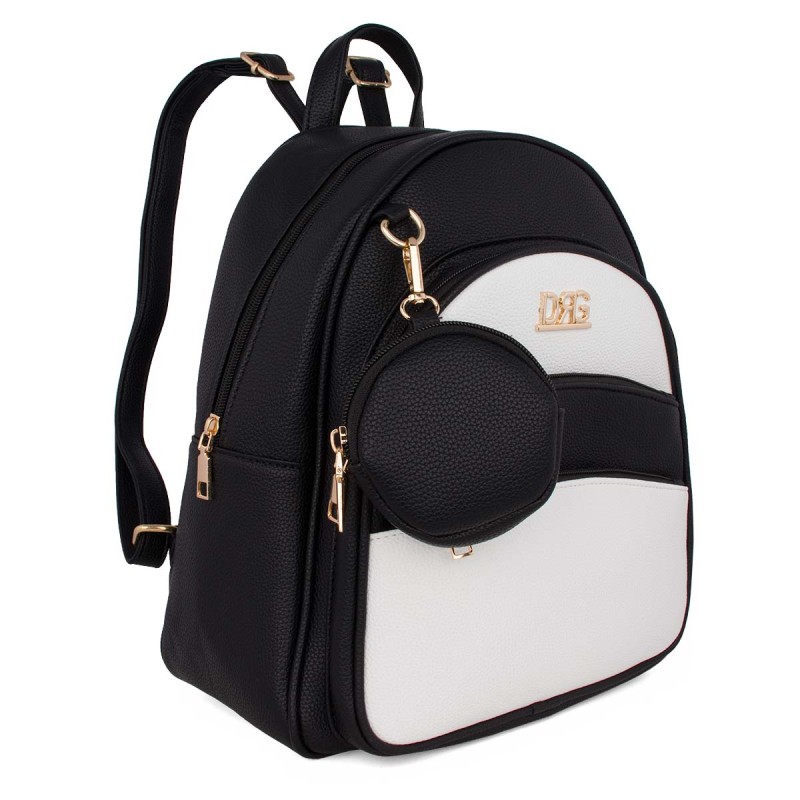 Women's backpack black. Eco-leather. It has 3 inner compartments, one with a zipper, and 3 outer compartments with zippers on the front part. Removable keychain with zipper. Dimensions: H 36cm, W 28cm, D 16cm. "Designed in Greece exclusively by De Raggi designers".